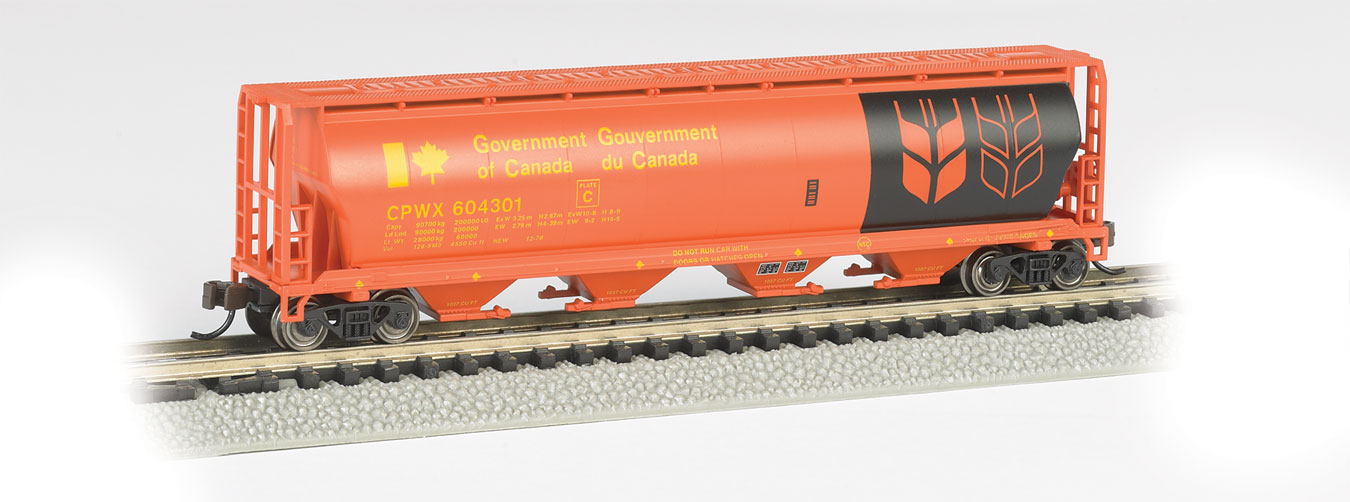 - Bachmann Canadian Cylindrical 4-Bay Grain Hopper – Ready to Run – Silver Series(R) Government of Canada CPWX (orange, black, yellow)