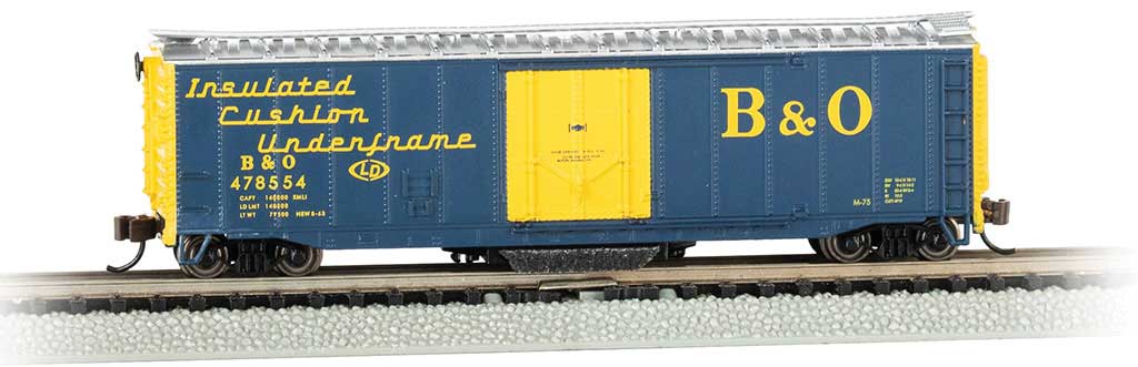 - Bachmann Track Cleaning 50′ Plug-Door Boxcar – Ready to Run Baltimore & Ohio #478554 (blue, yellow; Cushion Underframe Markings)