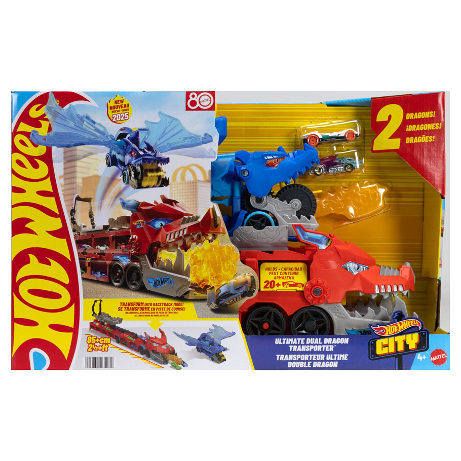 | Drive into battle with this large-scale dragon hauler that features an additional detachable dragon that eats toy vehicles! After knocking out cars with the fire-breathing dragon, unlock the smaller dragon and transform it into racetrack! Press the button to make its wings move and emulate a real dragon, then swoop in to make it eat cars. Return to the base and release the vehicles into the launchers where they can take off on side-by-side tracks! The hauler includes two 1:64 scale cars, but kids can store more than 20 vehicles in and on the two dragons.