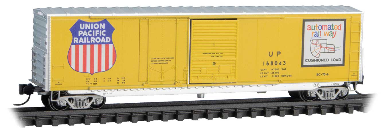 - Micro Trains 50′ Plug & Sliding Door Boxcar No Roofwalk – Ready to Run Union Pacific #168043 (Armour Yellow, silver, Automated Railway Map)