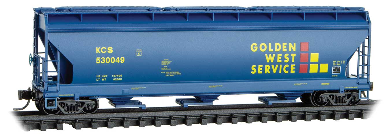 - Micro Trains ACF 3-Bay Center Flow Covered Hopper with Elongated Hatches – Ready to Run Kansas City Southern #530049 (Ex-Golden West, blue, yellow, red)