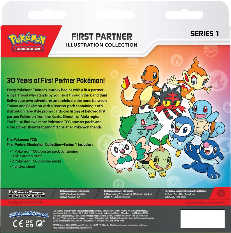 30 Years of First Partner Pokemon! Every Pokemon Trainer’s journey begins with a first partner, a loyal friend who stands by your side through thick and thin! Relive your own adventures and celebrate the bond between Trainer and Pokemon with a booster pack containing 3 of 9 illustration rare-style promo cards consisting of beloved first partner Pokemon from the Kanto, Sinnoh, or Alola region. You’ll also find two more Pokemon TCG booster packs and a fun sticker sheet featuring first partner Pokemon friends. The Pokemon TCG: First Partner Illustration Collection Series 1 includes: 1 Pokemon TCG booster pack containing 3 of 9 promo cards, 2 Pokemon TCG booster packs, and 1 sticker sheet.