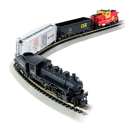 Includes an 0-6-0 steam locomotive, box car, quad hopper and Wide-Vision Caboose, 24″ circle of nickel silver E-Z Track, power pack, speed controller and illustrated instructions.